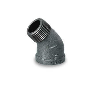 Description Description 1/2" Black Malleable 45° Street Elbow Features 150 LB Black and Galvanized 1/8” - 6” Diameter 100% Pressure Tested ASTM A197 ANSI/ASME B16.3 ANSI/ASME B16.14 UL/ULC and FM Approved ISO 9001: 2000 Downloads Specification Sheet View AllClose