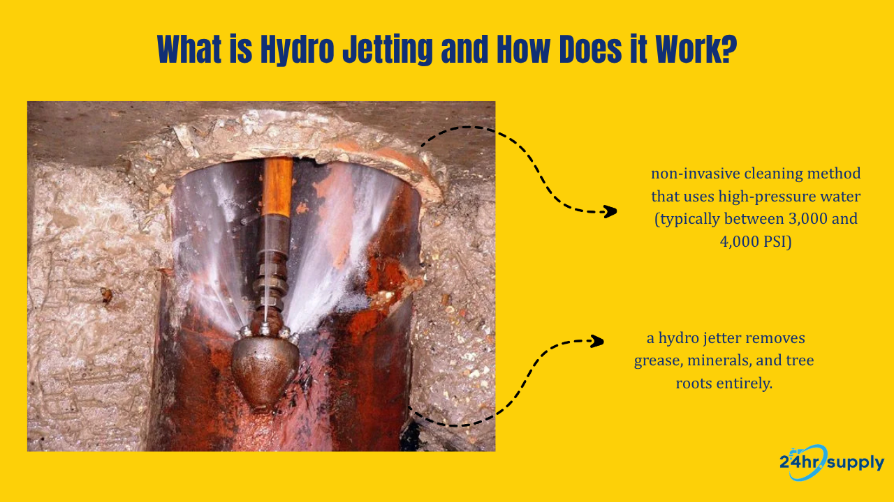 Hydro jetting is a non-invasive cleaning method that uses high-pressure water (typically between 3,000 and 4,000 PSI) to scrub the internal walls of a pipe.